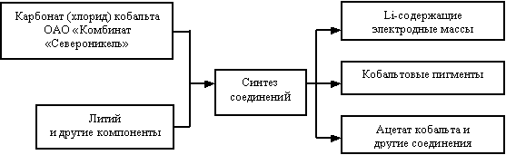 Производство солей и материалов на основе кобальта Краткое описание и техническая характеристика. Запуск на комбинате "Североникель" установки по переработке кобальтового концентрата с получением карбоната и хлорида кобальта обеспечил в Мурманской области производство исходного чистого сырья для синтеза широкого спектра других солей и соединений кобальта. Малотоннажные производства и получение новых материалов на основе кобальта в настоящее время не входят в задачи комбината, но могут быть реализованы на Апатитской площадке. К таким производствам следует отнести: получение кобальтовых пигментов, электродных масс для перезаряжаемых Li-аккумуляторов и некоторых чистых солей кобальта, включая ацетат кобальта для нужд катализаторной промышленности.