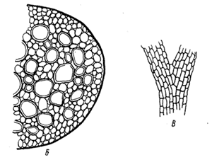 А — поперечный срез через слоевище; Б — часть верхушки веточки, вид клеток с поверхности