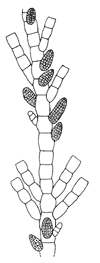 Часть слоевища с многоклеточными спорангиями Небольшое слоевище 2—6 см высоты, в виде вупротивно или односторонне разветвленных однорядных нитей 30—46 мкм толщины; клетки с многочисленными дисковидными хлоропластами. Многоклетные спорангии овальные, сидячие, несимметричные, развиваются односторонними сериями, длиной 28—52 мкм и толщиной 18—28 мкм. Встречается на водорослях в литоральной зоне.