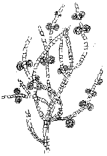 Часть слоевища с одноклетными спорангиями Пучки нитей до 6 см высоты. Главные ветви полисифонные, ветви последнего порядка моносифонные, все слоевище членистое, ветвление попеременное, супротивное, мутовчатое. Одноклетные спорангии крупные, шаровидные, обычно парные, развиваются друг напротив друга. Растет на камнях и водорослях, на литорали, в открытых и защищенных местах.