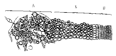 Поперечный срез через пластину. А — центральная часть, состоящая из «ситовидных» и «гифовых» клеток, Б — средний слой, В — коровый слой L. hyperborea. Растет на открытых прибою скалах в сублиторали.