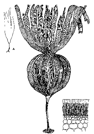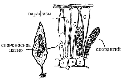 А — молодое растение; Б — взрослое растение; В — срез через пластину со спорангиями и парафизами L. solidungula. Встречается в арктических районах Баренцева моря, растет в сублиторали.
