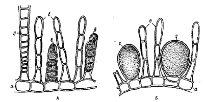 Слоевище с многоклетными (А) и одноклетными спорангиями (Б); а — базальная нить, б — вертикальная нить, в — многоклетные спорангии, г — одноклетные спорангии, д — волосок Слоевище в виде небольших дисков 1—3 мм в диаметре. Базальная часть однослойная. Вертикальные нити простые, слабо булавовидные. Имеются настоящие волоски. Одноклетные спорангии овальные, сидячие или на ножке; многоклетные спорангии булавовидные, с тупой вершиной, однорядные или местами многорядные, все клетки вертикальных нитей преобразуются в многоклетные спорангии. На водорослях.