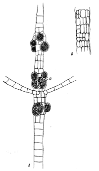 А — часть слоевища с одноклетными спорангиями (а); Б — нижняя часть нити Слоевище до 4 см высоты, в виде супротивно разветвленных нитей, главная ось многослойная, нити последнего порядка однорядные, слоевище членистое. Одноклетные спорангии до 33—38 мкм, развиваются группами, редко по 1—2, своими основаниями погружены в многослойные части слоевища. Растет в литоральных ваннах, на Palmaria.