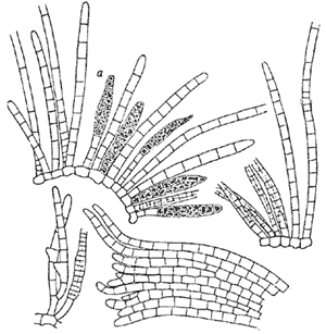 Разные части слоевища Микроскопическое слоевище, псевдопаренхимное в центре, нитчатое — по краю, с прямыми ассимиляционными нитями 100—250 мкм высоты. Волоски и спорангии развиваются прямо на базальном слое. Растет на Fucus vesiculosus, Laminaria digitata.
