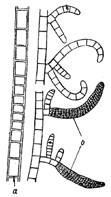 А — часть нити с интеркалярной зоной; Б — часть нити с многоклетными спорангиями Слоевище в виде однорядных, неправильно разветвленных и перекрученных нитей. Ветви последнего порядка короткие, отогнуты назад и крючковидно согнуты. Клетки нитей 8—12 мкм. Одноклетные спорангии овальные. Многоклетные спорангии веретеновидные, серповидно согнутые, 75—100 х 17—30 мкм, сидячие или на ножках. Рост интеркалярный в верхних частях ветвей, имеются ложные волоски. Растет на камнях и водорослях, в основном на литорали , на открытых и слабо защищенных местах.