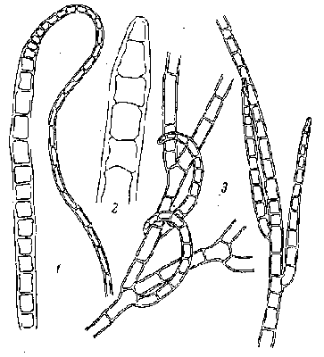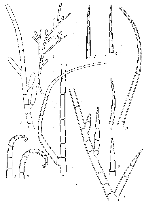 Верхушки веточек при разном увеличении A. centralis (Lyngbye) Kjellman. В защищенных от прибоя местах (россыпи, ванны). A. flagellata Kjellman. Вид широко распространен. Образует обширные дернины на камнях и скалах; при любой степени прибойности.