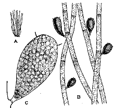Внешний вид растений (А), нити со спорангиями при разном увеличении (Б, В) Нитчатое слоевище сифонной структуры, нити слабо или почти неразветвленные, в основании ветвей иногда имеются перегородки. Хлоропласты мелкие дисковидные, образуют скопления на отдельных участках нити. В сублиторали, на глубине 5—10 м, на песчано-каменистом грунте.