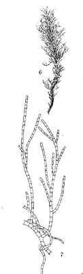 Внешний вид растения (А) и отдельной нити (Б) Кустистое слоевище, в виде небольшого пушистого шарика, сильно Внешний вид растений (А), вид клеток с поверхности (Б, В) и на срезе в разных частях слоевища (Г, Д) (Виноградова, 1974). Разветвленное, с однорядными нитями, клетки мелкие, боковые ветви отходят от боковой стенки клетки. На камнях и водорослях, на литорали; встречается летом.