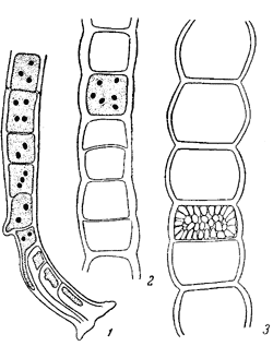 Клетки в разных частях слоевища Слоевище нитчатое, неразветвленное, клетки цилиндрические или бочонковидные, хлоропласт пластинчатый. На верхушках валунов и камней в верхнем горизонте литорали, предпочитает прибойные места, встречается в первую половину лета.