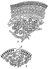 Поперечный срез через слоевище: А - с карпоспорами (а), Б - с тетраспорами (б) Слоевище грубонитевидное, в виде кустиков до 20 см высоты, разветвляется неправильно, поочередно или дихотомически. На поперечном срезе центральная часть состоит из округлых и изогнутых клеток. Встречается в зоне фукусов на литорали в защищенных местах.
