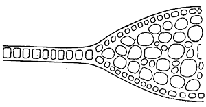 Крупное слоевище до 20 см высоты, розово-фиолетового цвета, со стеблевидной частью и листовидными пластинами, пластинки тонкие, от среднего ребра отходят параллельно с двух сторон под острым углом многочисленные ровные жилки. Растет в сублиторали, в прибойных местах, в поясе ламинарий.