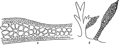 А — поперечный срез через пластину; Б — веточки с тетраспорангиями Слоевище плоское, кожистое, в виде кустиков, обильно попеременно разветвленных. Ветви линейной формы с короткими зубчиками по краю. Растет в сублиторальной зоне в поясе ламинарий и красных водорослей. Обычный вид.