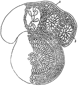 Polyides rotundus (Gmelin) Greville Срез через слоевище с карпоспорами, а — нематеций, б — карпоспоры Слоевище в виде кустиков до 15 см высотой, с цилиндрическими ветвями, дихотомически разветвленными, черно-красного цвета, прикрепляется подошвой. Растет на песчано-каменистой литорали в поясе фукусов в защищенных от прибоя местах.