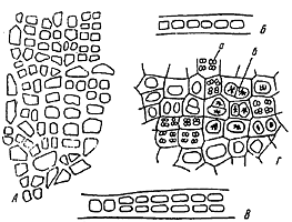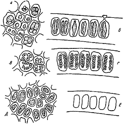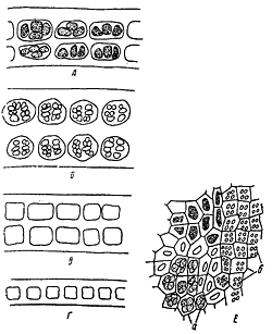 Клетки с карпоспорами: А — вид с поверхности; Б — на поперечном срезе. Клетки со сперматангиями: В — вид с поверхности, Г — на поперечном срезе. Стерильная пластина: Д — клетки с поверхности; Е — на поперечном срезе.