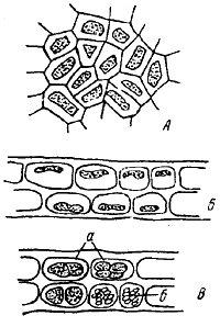 А — клетки с поверхности; Б и В — поперечный срез через пластину; Г — сперматангии (а) и карпоспоры (б) с поверхности Porphyra helenae