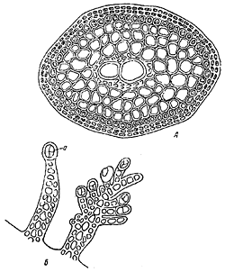 А — срез через слоевище; Б — веточки с тетраспорангиями Слоевище в виде кустиков до 22 см высоты, плоское, обильно перисто разветвленное. Растет в сублиторальной зоне в поясе ламинарий и красных водорослей, предпочитает открытые места и проливы; обычный вид.