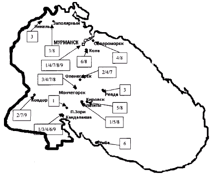 В области сконцентрированы крупнейшие предприятия горнодобывающей промышленности и цветной металлургии, деятельность которых в течение нескольких десятилетий привела к значительным, порой необратимым последствиям для растительного и животного мира. Главными стационарными источниками загрязнения атмосферы являются предприятия цветной металлургии - ОАО "Кольская горнометаллургическая компания", а также энергетики, военного комплекса, химической промышленности и стройиндустрии. В зоне выбросов комбината "Печенганикель" уничтожены лесные массивы, загрязнены тяжелыми металлами и соединениями серы верхние слои почвы. В 2000 г. показатель экономии воды за счет использования оборотных систем водоснабжения составил всего 35%, что более чем в 2 раза ниже среднего уровня по Российской Федерации (76,5%). Общий сброс загрязненных сточных вод в поверхностные водные объекты распределяются в основном между предприятиями химической промышленности, цветной металлургии и ЖКХ. Наиболее крупными источниками загрязнения водных объектов являются: ОАО "Кольская горнометаллургическая компания", АО "Апатит", г. Кировск; объекты ЖКХ городов Мурманск, Апатиты, Кандалакша, Североморск, Полярный. Характерными загрязняющими водные объекты веществами являются соли тяжелых металлов, в том числе никеля, меди, кобальта. Наибольшее количество твердых промышленных отходов образуется на металлургических предприятиях. В 2000 г. на предприятиях области образовалось 73,4 тыс. т. токсичных отходов, из которых использовано на производстве и полностью обезврежено более 60%.