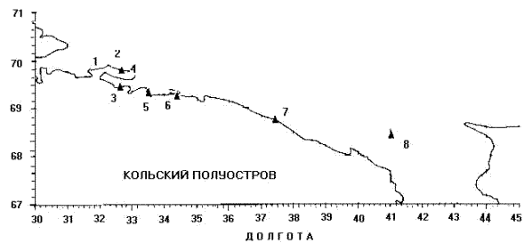 Многолетний тренд нефтяного загрязнения экосистемы Кольского залива имеет выраженную тенденцию роста в период с 80-х годов по настоящее время. Погребенные в осадки нефтяные углеводороды в условиях экосистемы залива сохраняют высокую (более 25 лет) геохимическую устойчивость в деструкции. Мониторинг прибрежных вод Кольского полуострова В апреле 2000 г. сотрудниками ПИНРО были отобраны на химический анализ пробы из поверхностного и придонного слоев воды Баренцева моря вдоль Мурманского берега от Варангер-фьода до мыса Святой Нос. Схема станций отбора проб представлена на рис. 1. Подготовка и химический анализ проб выполнены в соответствии с методическими руководствами Международного совета по исследованию моря (ICES). Достоверность результатов и качество аналитических работ оценивались при участии химической лаборатории ПИНРО в Схеме лабораторного тестирования по проекту QUASIMEME (Гарантия качества информации при мониторинге морской среды в Европе), который осуществляется странами Европейского Союза.