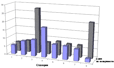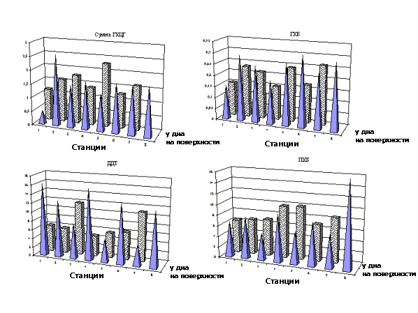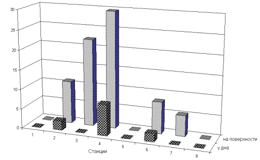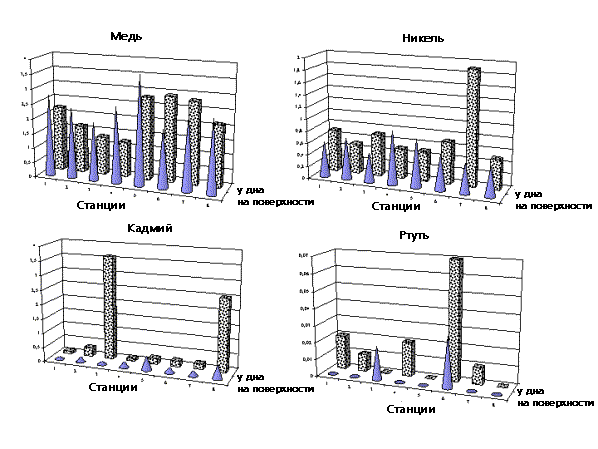 Рис. 4. Суммарные концентрации гексахлорциклогексана (a-ГХЦГ, g-ГХЦГ), ДДТ и его метаболитов (p'p-ДДТ, o'p-ДДТ, p'p-ДДД, o'p-ДДД, p'p-ДДЕ), гексахлорбензола (ГХБ) и полихлорбифенилов (ПХБ) в поверхностном и придонном слоях воды прибрежной зоны Кольского полуострова, нг/л. Концентрации ГХБ в прибрежных водах Мурмана варьировали в очень узком диапазоне 0,15-1,29 нг/л и не превышали рыбохозяйственную ПДК (Перечень рыбохозяйственных нормативов:, 1999). Суммарные концентрации ПХБ (конгинеры с номерами по номенклатуре IUPAC 28, 31, 52, 77, 99, 101, 105, 118, 126, 138, 153, 156, 180, 187) в поверхностном слое воды прибрежной зоны Кольского полуострова изменялись от 5 до 16 нг/л, в придонном - от 6 до 10 нг/л и только на станции 8 превышали рыбохозяйственный норматив 10 нг/л (см. рис. 4 и 1). Из индивидуальных конгинеров ПХБ в прибрежных мурманских водах в это время года преобладали высокомолекулярные гекса- и гептахлорированные бифенилы с номерами 118, 138, 153, 180 и 187. Если в морской воде доминируют низкомолекулярные ПХБ, можно говорить о загрязнении водных масс полихлорбифенилами вследствие атмосферных выпадений, так как низкомолекулярные ПХБ в силу своих физико-химических свойств в большей степени подвержены атмосферному переносу. Превалирование в прибрежных водах Мурмана высокомолекулярных ПХБ приводит к выводу о существовании местных источников загрязнения. Тяжелые металлы. Концентрации тяжелых металлов в морских водах варьируют в весьма широких диапазонах вследствие воздействия гидрографических параметров, высокой биологической продуктивности и наличия источников загрязнения. Концентрации кобальта и свинца в прибрежных водах Кольского полуострова были ниже пределов обнаружения применяемого метода анализа. Концентрации меди в поверхностном слое воды изменялись от 2.0 до 3.7, цинка - с 36 до 69, никеля - от <0.5 до 0.9, хрома - от 2.7 до 4.0, марганца - от 0.9 до 4.0, железа - от 6.0 до 12.0, кадмия - от <0.1 до 0.5, ртути - от 0.00 до 0.03 мкг/л. Вертикальное распределение тяжелых металлов в толще воды имеет довольно "пестрый" характер, поэтому их концентрации в поверхностном и придонном слоях воды могут значительно отличаться. В придонном слое прибрежных мурманских вод концентрации тяжелых металлов были выше, чем в поверхностном слое (рис. 5). В целом, концентрации перечисленных выше тяжелых металлов как в поверхностном, так и придонном слоях воды прибрежной зоны Кольского полуострова не превышали установленных рыбохозяйственных ПДК (Перечень рыбохозяйственных нормативов :, 1999).