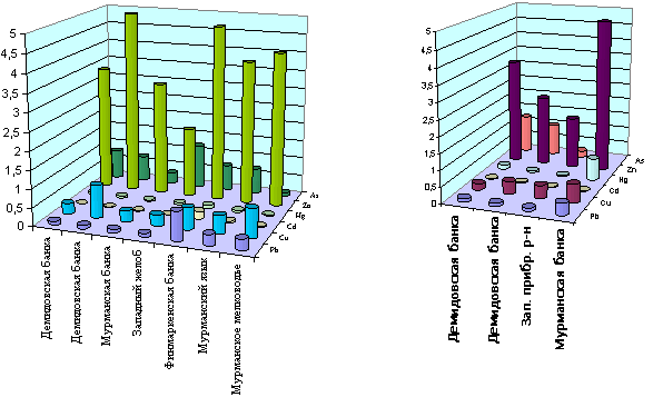 Рис.10. Сравнительное содержание тяжелых металлов в мышечных тканях важных промысловых рыб Баренцева моря - трески и пикши, мг/кг сырого веса. 2000 г. Содержание искусственных радионуклидов в рыбах и водорослях в последнее время фактически не меняется. Среднее содержание 137Cs в рыбе и в креветках, занимающих немаловажную часть в рационе трески, находятся на уровне минимально определяемой величины (<0.5 Бк./кг сырого веса). Эти уровни установились в море на уровне 1994 г. Авария и затопление АПЛ "Курск" не нашли отражения в общей экологической ситуации в Баренцевом море в целом и промысловой биоте, в частности. Исследованиями подтверждается отмеченная ранее тенденция немногим более высоких уровней накопления поллютантов в западных районах, испытывающих сильное влияние атлантических вод.