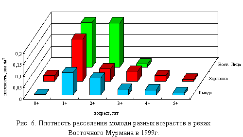 Состояние популяций лососевых рыб восточного Мурмана. По обобщенным данным мониторинговых наблюдений ММБИ численность разновозрастной молоди атлантического лосося в реках Мурманской области достаточно высока. Специфика процесса обработки информации позволяет оперировать в настоящее время данными наблюдений, полученными в 1999 г. Эти материалы показывают, что плотность расселения пестряток в реке Рында составила в среднем 0.23 экз./м2. В сравнении с предшествующими наблюдениями можно полагать, что это количество близко к оптимальному. Плотность расселения молоди семги в р. Харловка (с притоками) составляет от 0.15 до 0.52 экз/м2, в среднем - 0.34 экз/м2. Наличие значительных плотностей молоди в возрасте 0+ в нижнем течении реки, начиная с первых плесов, позволяет сделать вывод, что нерест семги идет по всей длине реки. В реке Восточная Лица плотность расселения пестряток составила от 0.2 до 0.64 экз./м2, в среднем - 0.4 экз./м2. Расчетная потенциальная продуктивность покатников может составить 6100 экз. при их средней массе 37.4 г. Соотношение плотностей расселения молоди семги различных возрастных категорий, в основных нерестовых реках Мурманской области, представлено на рисунке 6. Данные свидетельствуют о достаточно высоком современном репродуктивном потенциале этих рек.