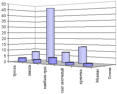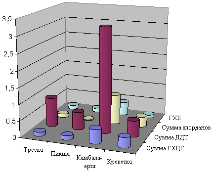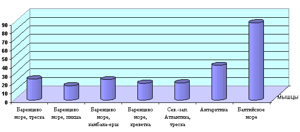 Рис. 9. Сравнительные уровни накопления групп пестицидов в тканях рыб, нг/г сырого веса Среди массовых видов промысловых рыб бентоядные рыбы в большей степени склонны накапливать токсичные металлы, в первую очередь ртуть. По существующему мнению, индикатором ртутного загрязнения считается треска (Julshamn et. al., 1985). Рисунок 10 показывает, что пространственные различия концентраций достигают 50%. однако весьма малы по абсолютной величине. Уровень накопления ртути в треске на порядок меньше допустимых норм. Однако индикаторными видами следует считать, видимо, виды преимущественно бентосного типа питания.