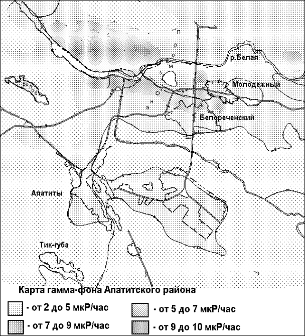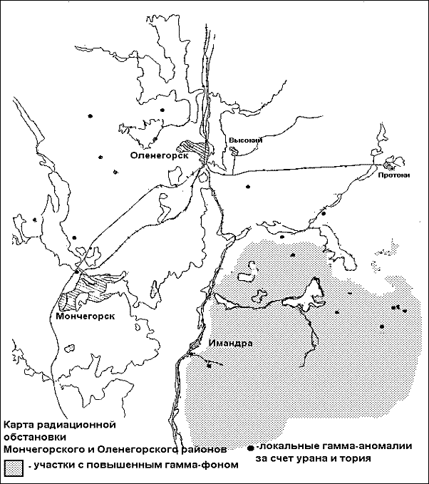 Радиационная обстановка на территории районов в основном определяется природными факторами, т.е. распределением урана, тория и калия в породах. В разные годы на территории этих районов было выявлено несколько десятков локальных гамма-аномалий интенсивностью от 25 до 10000 мкР/час. Все эти участки размещаются на удалении от городов и поселков и не представляют угрозы здоровья населения. ![]() Радиационную обстановку городов Мончегорска и Оленегорска можно считать вполне благополучной. Она обусловлена как природными факторами, так и активной деятельностью человека. В распределении гамма-излучения на территории городов имеются особенности. Более низкие значения характерны для городских окраин, пустырей, парковых зон, а также спортивных площадок. Жилые массивы и производственные территории характеризуются более высокими значениями. Такие колебания гамма-фона связаны в первую очередь с особенностями применяемых при строительстве материалов - составом кирпича, щебня, наполнителей асфальта, бетона, гранитной крошкой. Кандалакшский район