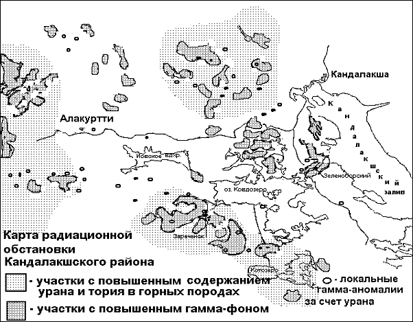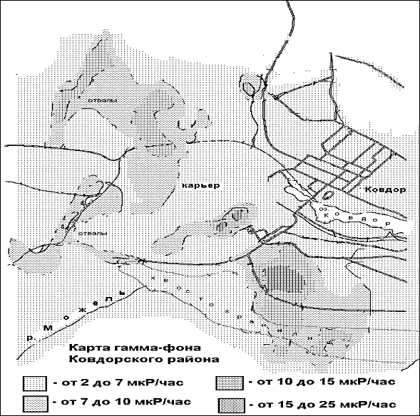 ![]() На общем низком фоне выделяются площади, в пределах которых максимально проявлены естественные неблагоприятные факторы радиационной обстановки. Содержание естественных радиоактивных веществ (урана, тория и калия) в породах этих районов выше, чем на остальной территории. Поэтому они наименее благоприятны для развития здесь социально-бытовой инфраструктуры. В пределах этих зон выявлено значительное число локальных гамма-аномалий с интенсивностью от 50 мкР/час до 6000 мкР/час. Содержание урана на всей территории составляет обычно сотые доли процента, а на этих участках возрастает до десятых долей процента. Гамма-фон в черте жилой зоны города Кандалакши характеризуется низкими значениями и варьируется в пределах от 4 до 14 мкР/час. Участки с повышенным гамма-фоном имеют техногенное происхождение и связаны с применением гранитной крошки: в гранитных плитах в качестве облицовочного материала, в огнеупорном кирпиче, в качестве материала-наполнителя асфальта. Выявлена зона повышенной концентрации цезия-137, приуроченная к долине р. Нива. Вызвана аномалия, вероятнее всего, смывом в придолинную часть следов "деятельности" Кольской АЭС. Не исключается возможность загрязнения территории в верховьях р. Нивы чернобыльскими осадками. Ковдорский район ![]() Источниками повышенного гамма-фона на территории района являются бедные уран-ториевые руды Ковдорского месторождения, которые при его разработке идут в отвалы или используются для изготовления стройматериалов, и высокорадиоактивные отходы переработки комплексных руд на комбинате. Вне жилой зоны города Ковдора выявлено 4 участка с повышенным гамма-фоном, основной вклад в который вносят уран и торий. Эти аномалии связаны с отвалами, хвостохранилищами, карьером. Радиационная обстановка в городе Мурманске