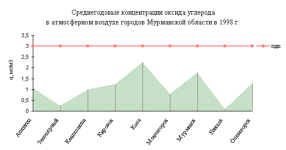 В г. Кола среднегодовая концентрация оксида углерода ниже ПДК, но несколько выше, чем в остальных городах области.