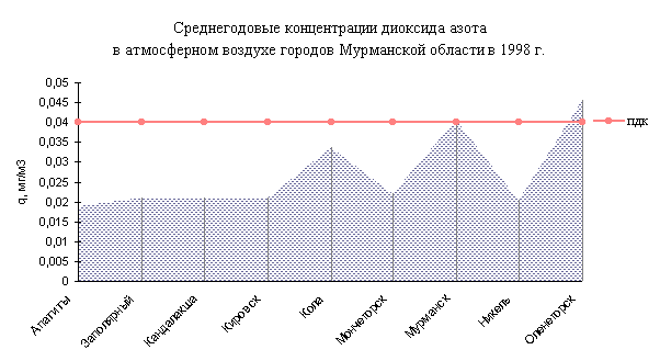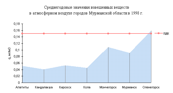 В г. Мурманске загрязнение атмосферного воздуха значительнее в восточной части города (ПНЗ № 17). Средняя концентрация за год на ПНЗ № 17 - 0.005 мг/м В г. Заполярном среднемесячные концентрации выше допустимой санитарной нормы отмечались в апреле - 2.0 ПДК, в январе, октябре - 1.7 ПДК.