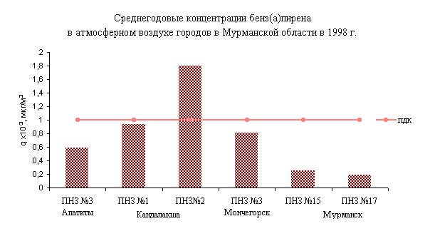 В г. Мурманске среднегодовая концентрация не превышала санитарную норму. В холодное время года, когда особо неблагоприятные условия рассеивания способствовали накоплению выбросов бенз(а)пирена от источников отопления и автотранспорта, наблюдалось увеличение содержания до 1.2- 1.3 ПДК.