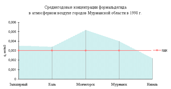 Среднегодовая концентрация формальдегида в городах области превышает санитарную норму: в г. Мончегорске -1.6 ПДК, в г. Мурманске-1.3 ПДК, в г.Заполярном -1.2 ПДК, в г. Кола- 1 ПДК.