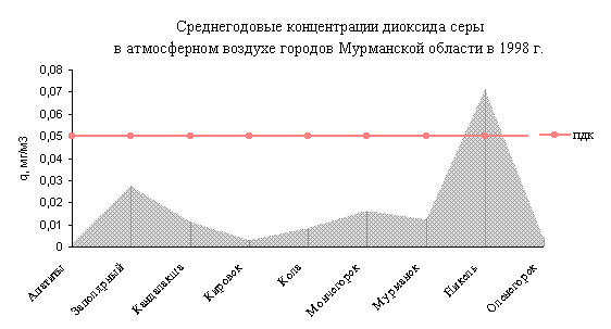 Повышенные концентрации регистрировались, в основном, при юго-западных ветрах со стороны АО “Комбинат “Североникель”, а также при слабых неустойчивых ветрах. На ПНЗ №2 (проспект Металлургов) была зафиксирована в июне наибольшая из максимальных разовых концентраций - 1.16 мг/м В остальных городах области по данным Мурманского УГМС содержание диоксида серы ниже уровня допустимой нормы, но наблюдается некоторое увеличение средних концентраций в зимние месяцы в период отопительного сезона по сравнению с летними.