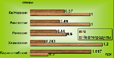 Как и в прошлом году, во всех пробах содержание никеля и меди превышало ПДК. В целом за год концентрация меди превышала ПДК в 20 раз, а никеля - в 1.5 раза и, по сравнению с прошлым годом, содержание меди не изменилось, а никеля - возросло в 2 раза.