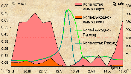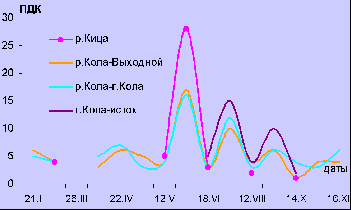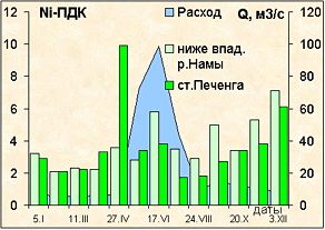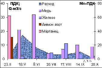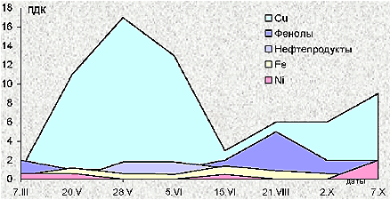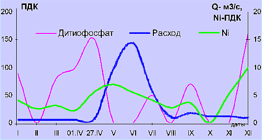Максимальная концентрация никеля (36 ПДК) была зарегистрирована в период водоотдачи из снега (27 апреля), азота нитритного (142 ПДК) - в зимнюю межень (12 февраля), и меди (40 ПДК) - на спаде половодья (8 июля).