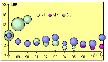 Самое высокое содержание никеля (4.6 ПДК) было выше, чем в 1997 году и отмечалось в октябре, но средняя за год концентрация была в пределах ПДК, что соответствует уровню прошлого года.