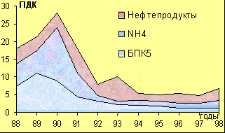 Т.о., в 1998 году возросло содержание марганца и нефтепродуктов, снизилось – цинка, не изменилось – меди и взвешенных веществ.