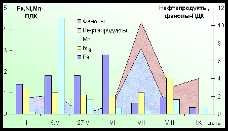 Превышение предельно допустимой концентрации наблюдалось: в 87% - марганца, цинка и натрия, в 95 и 70% - органических веществ (по ХПК и БПК Максимальные концентрации наблюдались: никеля (138 ПДК) - с конца ноября до второй декады декабря; меди (133 ПДК) – в мае в половодье; кобальта (9 ПДК), цинка (3.5 ПДК) и калия (2 ПДК) – в феврале; марганца (14 ПДК) – в декабре; сульфатов (18 ПДК) – в январе; ХПК (3 ПДК) - в середине апреля; фенолов (15 ПДК), БПК