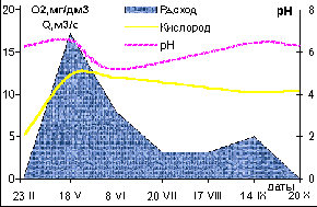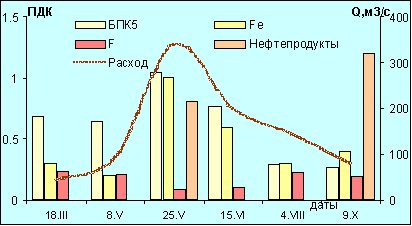 Максимальная концентрация нефтепродуктов и азота нитритного превышала ПДК в 10 и 8 раз, соответственно, и наблюдалась в низкую воду зимней межени – в конце апреля. Среднее содержание нитритного азота было в пределах 1.5-2 ПДК, а нефтепродуктов – близким к ПДК.
