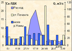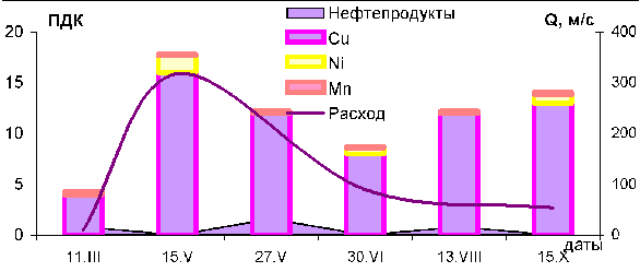 Максимальная концентрация никеля (5.4 ПДК) была зарегистрирована на пике, меди (18 ПДК) – на спаде половодья. Содержание взвешенных веществ в реке в течение года было невелико (0 – 2 мг/дм