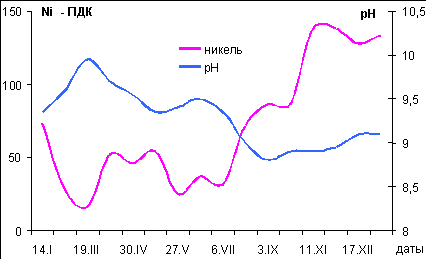 Концентрация никеля в р.Нюдуай изменялась в течение года от 16 до 138 ПДК. Причем, чем выше рН (т.е. более щелочная среда), тем меньше содержание в воде никеля. Это объясняется тем, что в щелочной среде катионы никеля связываются свободными анионами ОН