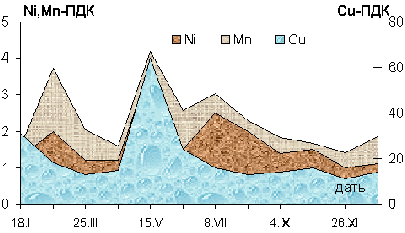 Среднегодовая концентрация никеля (71 ПДК) и меди (50 ПДК) превышала уровень экстремально высокого загрязнения, кобальта (3 ПДК) – высокого загрязнения.