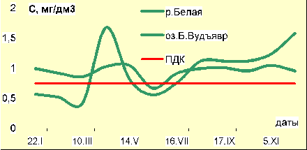 Несмотря на то, что в 3-х пробах воды из четырех концентрация цинка превышала ПДК, по сравнению с прошлым годом его максимальная и средняя концентрация снизилась в 2 раза и составила 1 ПДК.