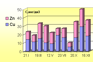 Содержание меди в этих водных объектах во всех отобранных пробах превышало ПДК; средняя концентрация за год - 9 ПДК - была одинаковой; содержание меди изменялось в интервале от 3 до 20-22 ПДК, максимальная концентрация меди была зарегистрирована в мае.