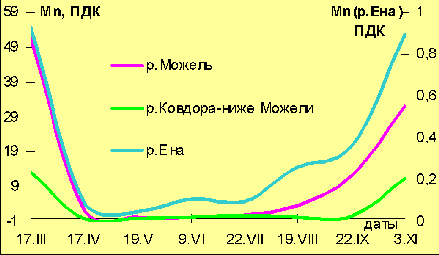 Вода в реках загрязнена марганцем, фосфатами, гидрокарбонатами, щелочными металлами и др., поступающими со сточными водами из хвостохранилища. Поэтому содержание этих веществ в р.Можель – наибольшее. Влияние загрязненного притока распространяется и на качество воды в р.Ковдоре. Это наглядно показано на рисунке: кривая содержания марганца и фосфатов в Можель повторяет кривую содержания этих веществ в Ковдоре ниже Можель. Максимальная концентрация марганца в р.Можель (51 ПДК – ЭВЗ) и в р.Ковдоре ниже впадения р.Можель (13 ПДК - ВЗ ) наблюдалась в марте в период зимней межени, когда разбавление природными водами – минимальное. Самая высокая концентрация фосфатов наблюдалась в р.Можель (6 ПДК) и в р.Ковдоре (4 ПДК) – в сентябре. Такая же зависимость сохраняется в течение года и по содержанию сульфатов: максимальное содержание этого аниона наблюдалось в ноябре – в р.Можель–1.5 ПДК, в р.Ковдоре – 1 ПДК. Самое низкое содержание сульфатов в этих водотоках отмечалось в марте.