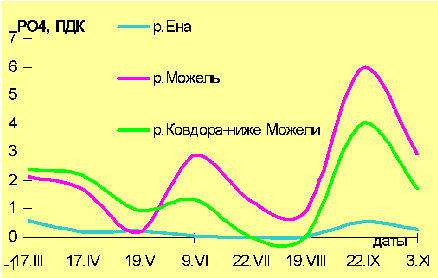 Концентрация фосфатов в р. Можель была выше ПДК более чем в 2 раза, а в р. Ковдоре – превышала предельно допустимую концентрацию в 1.5 раза.