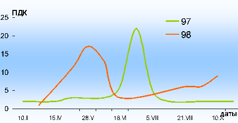 По сравнению с прошлым годом несколько возросло содержание марганца: среднегодовая концентрация его была выше ПДК в 4.4 раза ( в 1997г. - 3.7 ПДК).