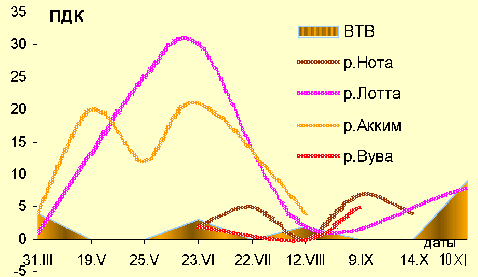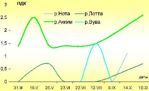 Среднегодовая концентрация меди в этих створах превышала ПДК в 7 раз, а максимальная - 16-17 ПДК – наблюдалась в 1 декаде июня в половодье. В это же время наблюдались и максимальные концентрации нефтепродуктов, причем, в оз.Чунозеро (4.4 ПДК) оно было более чем в 2 раза выше, чем в р.Вите (2 ПДК). В целом за год содержание нефтяных углеводородов в р.Вите не достигало ПДК, а в оз.Чунозеро превышало ПДК в 1.4 раза.
