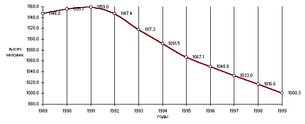 * численность наличного населения за 1989 г.г. дана по итогам переписи, за 1990-1999 г.г. - расчетные данные Госкомстата РФ на начало года.